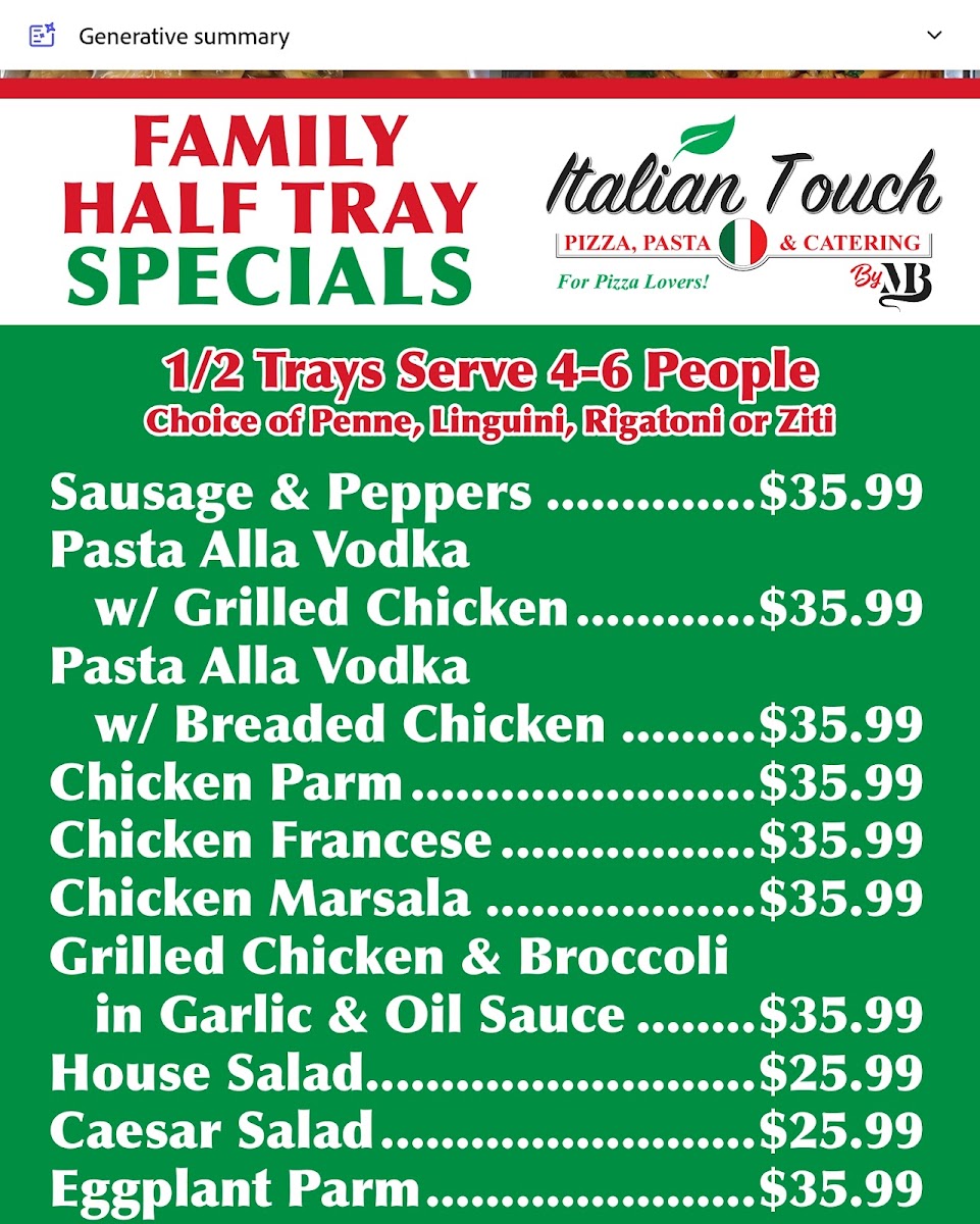 Welcome to Italian Touch Pizza Pasta and Catering, a gem nestled in Staten Island, NY. This delightful establishment boasts a menu that celebrates authentic Italian flavors, from its classic NY-style pizzas to hearty pastas. Customers rave about the perfect sauce, cheese, and crust that define a true NYC pizza experience. The generous sandwiches and mouth-watering garlic knots have left diners like Fran Quinn and Kedar Bryant completely satisfied, praising the freshness and portion sizes.